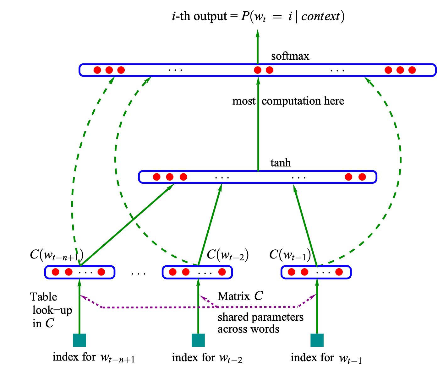 \(f(i, w_{t-1}, ..., w_{t-n+1}) = g(i, C(w_{t-1}), ..., C(w_{t-n+1}))\)In this architecture, g is a neural network that takes the context word embeddings